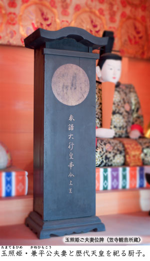 玉照姫・兼平公ご夫妻のご位牌は、現在に至るまで笠寺観音に安置され、良縁を願う参詣者を迎え入れ続ける事が出来た。 ここに、明治以来およそ100年ぶりに「玉照堂」を再建し、そこに玉照姫ご夫妻をお迎えする事となった。 当山往年の様相を彷佛とさせ、当山では更に参拝しやすい環境を目指している。 *詳しくはメールにてお問い合わせ下さい。 *過去の誤記について:玉照姫座像・兼平公木像のうち、兼平公座像は笠寺観音旧蔵ではありませんでした。これは管理人の誤解によるもので、申し訳ありませんでした。今後気をつけてまいります。 |