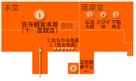| 2:六地蔵堂 | 地獄から天界まで、全ての生きる者たちの苦悩を救おうとされる、六種のお姿のお地蔵様。 | |